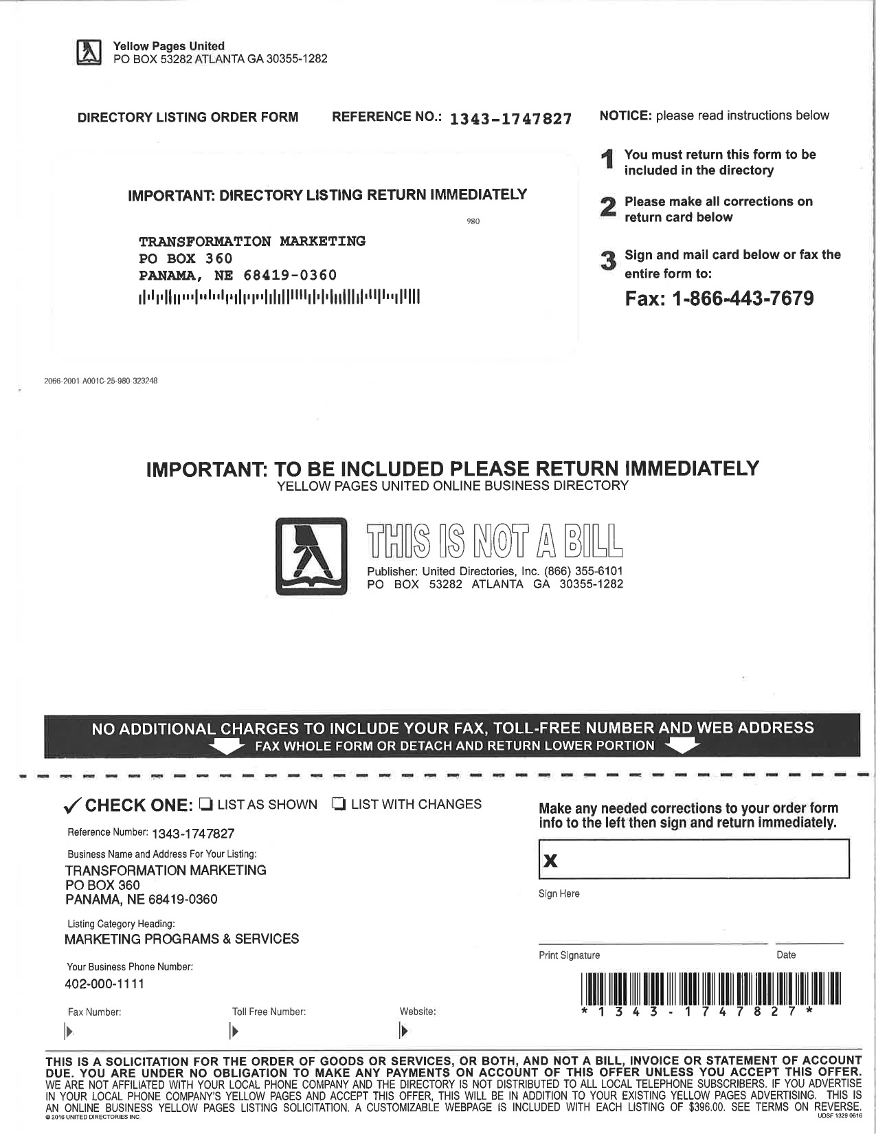 Just the other day, Transformation Marketing received mail from Yellow Pages United. This may not sound strange at all− in fact, it probably sounds quite ordinary that as a small business, we would want to be listed in Yellow Pages and potentially advertise our services. However, this is actually a scam. We want to send out a warning to our clients and our readers to ensure you all don’t fall into this trap or similar scams that happen to companies all the time.
