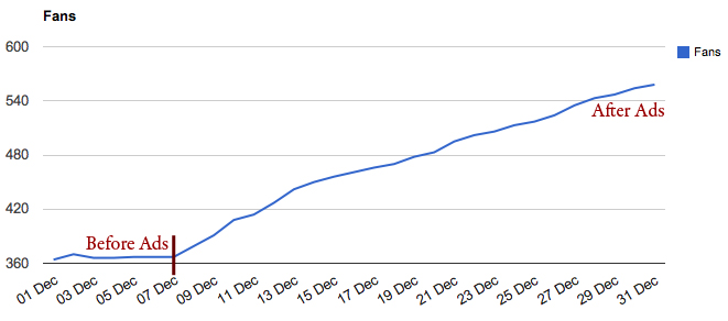 We will call the next client, Client B. (We know… It’s very original!) In November, Client B added 11 new fans to their Facebook page. We began running their Facebook ads on December 5.