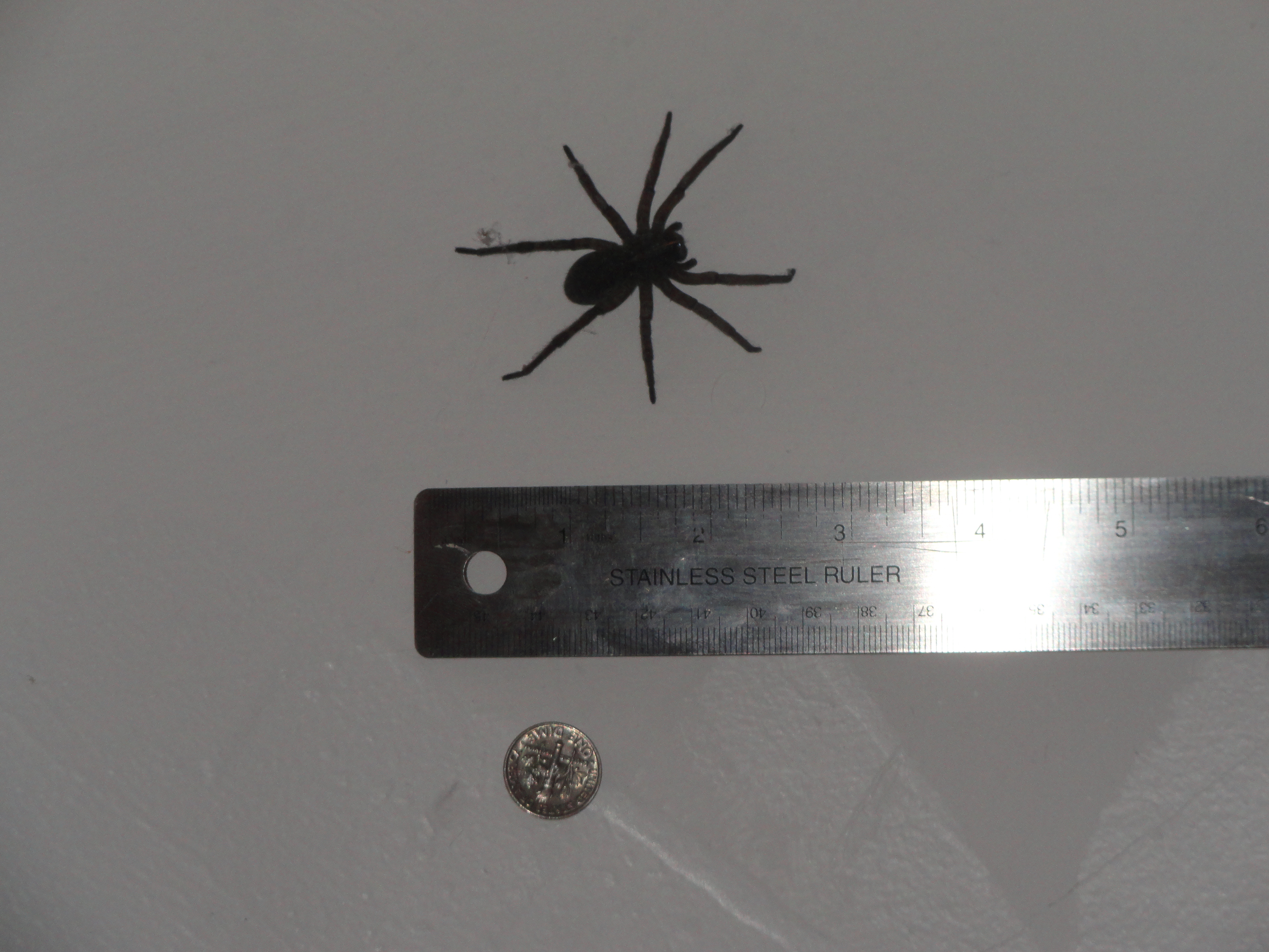 I (Melissa) instantly ran for my camera, because we HAD to get this on record. It is by far the biggest spider I’ve seen, so I felt I had to remember it. I’m not really sure why I had this reaction, because I am one of the 3 that does not like spiders. However, this guy was fairly motionless, so I had scrounged up enough courage to inch towards it at a snails pace in order to get a good picture. But not before Travis had to retrieve the comparison items. He wasn’t scared of this beast at all, so he had no problem walking right up to it and setting up our props for showing how big this thing really was.