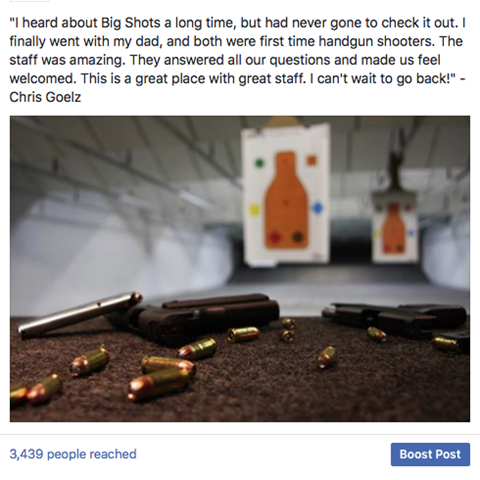 BigShots is a local gun store and indoor gun range. With Facebook’s advertising guidelines, it’s nearly impossible to promote their posts or page. But we like a challenge. When they asked us to help out with their social media campaign, we knew it’d be a difficult one, but we also knew we could hit the target. Within two months, we had a post organically reach nearly 3,500 people and receive over 100 likes. It doesn’t stop there- a month later we had a post get almost identically the same reaction. We continue to see stellar organic engagement and reach (promotion without ads) for each of the BigShots posts.